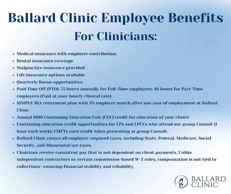 We are looking for dedicated, compassionate professionals to join our team in delivering high-quality mental health care to the youth of the Twin Cities. Ballard Clinic is one of the largest private practices in the Twin Cities that focuses exclusively on children, adolescents, and young adults.